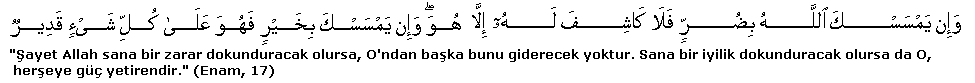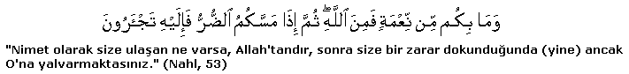 ![]() Menfaatleri ve mazaaratları yaratan, ancak Allah'tır. Bütün olaylar sebeplerle meydana geliyorsa da, sebepler yok olanı var edemez. Onlar ancak insanların elinde birer tutamak ve Hak'tan bir isteme vesikası olmak üzere yaratılmıştır. İnsanın menfaat ve zararlarına hakim ve rakipsiz müessir ancak Allah'tır. O, insanlara, menfaat ve zararları ayırd edici kuvvet vermiştir. Allah'ın bir zarar vermeyi dilemesini hiç bir şey önleyemez. Allah her şeyi yaratan ve yarattığına bir etki koyandır. Her şeyin olumlu ve olumsuz etkisi O'nun yed-i kudretindedir. O'nun iradesi, dilemesi ve izni olmadan hiçbir şey etkisini gösteremez. Allah'a sadece Dâr ismiyle dua etmek caiz değildir. Bu nedenle her iki isimle (Darr, Nâfi) birlikte dua edilmelidir. Bu iki ismin birlikte zikredilmesi, Allah'ın dilediğine yarar sağlamaya dilediğine de zarar vermeye kadir olduğunu gösterir. Zira zarar verme veya yarar sağlama gücüne sahip olmayanın varlığı ve etkiside olmaz. (3) Bu ismi bilmenin faydaları: Her müslüman Allah'tan başka zarar veren biri olmadığına inanmalı, O'nun iradesi ve fiiliyle gerçekleştiğini bilmelidir.Dünya hayatı da ahiret hayatı da yarar ve zarar arasında taksim edilmiştir. Buna göre cennet saf yarar, cehennem de saf zarardır. Dünyada geçekleşen zarar, ahiret için bir yarara dönüşebilir. Bu durumda bu dünyadaki zarar, mecazi anlamdadır. Eğer dünyadaki zarar, ahiret için de bir zarar ise bu durumda zarar gerçek anlamdadır. Kaynaklar: 1) Nahl, 53 2) Enam, 17 3) Esmâ-ül Hüsna, Karınca Yayınları, Nisan 2004 4)Calligraphy, The Most Beautiful Names, Tosun Bayrak, Threshold Books, 1985 5)Islam City |